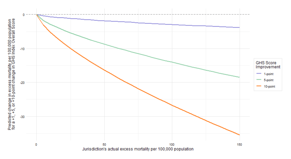 • Based on our modelling, a hypothetical jurisdiction with an excess mortality of 100 per 100,000 population, could expect to have a reduction of 26.7 deaths per 100,000 population if their GHS index score was 10 points higher.