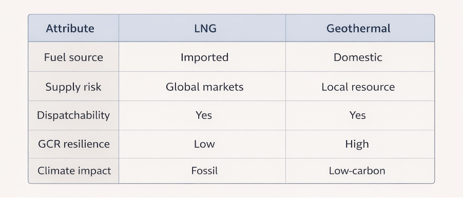 - Geothermal stands out as a good alternative: it provides firm, dispatchable power like LNG, but is entirely domestic and fuel supply-chain independent.